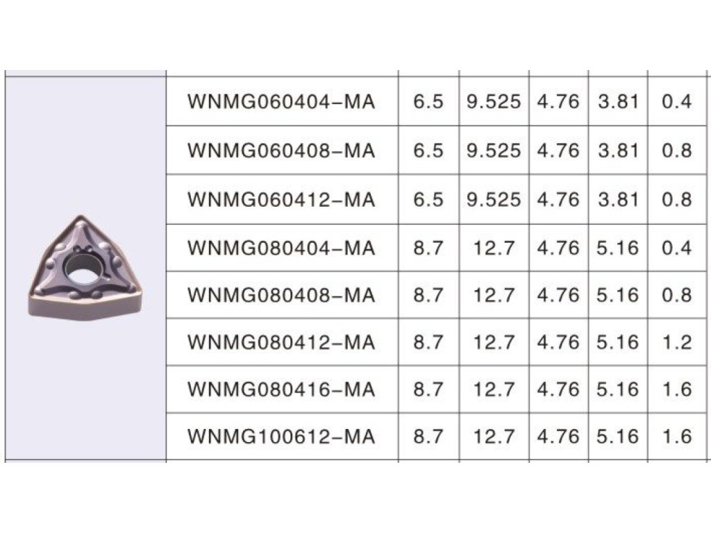 Vložky WNMG sú veľmi všestranné, často používané pri hrubovaní a jemnom obrábaní rôznych kovových materiálov, najmä pri sústružení, kde sa vyžaduje odolnosť proti opotrebeniu a vysoká výkonnosť pri rôznych rýchlostiach rezania.